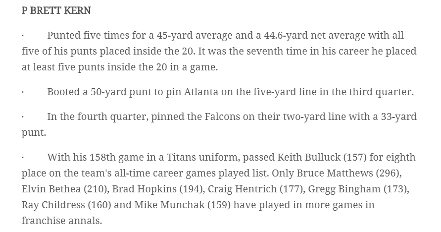 Also quick thing. Brett Kern has been the best player on the Titans for a few years now. Him and Ryan Succop has carried this team as much as two special teams players have ever done. He has gone to back to back pro bowls and has a career punting average of 45.9 years which is 11th all-time in NFL history. The worst part of him being so awesome is that we have to use him way to much because our offense has been poop, also for years. He has 25 punts this year which is most in the NFL. This year he already has punts of 70, 63, and 61. He’s the best.