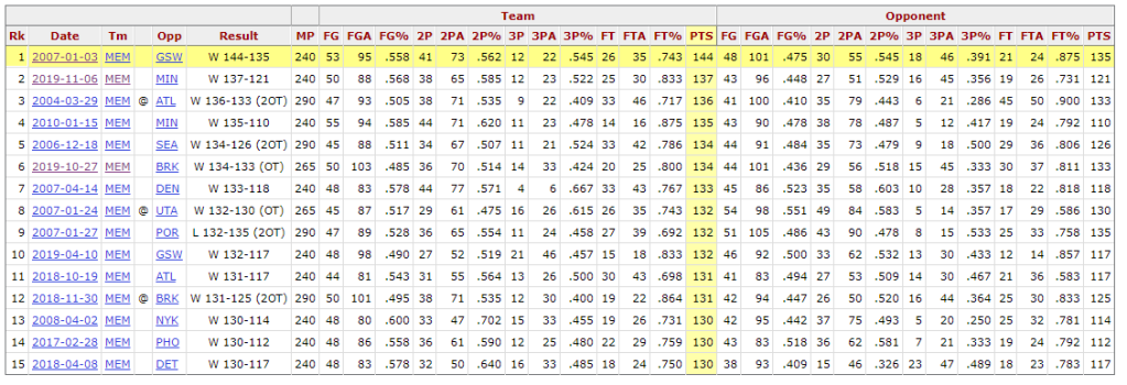 Here is another fun fact. With 130 points last night, that marks the 15th time the Grizzlies have score 130 or more points in a game and the 9th time they have done it without going to overtime. How about that!