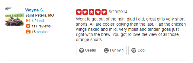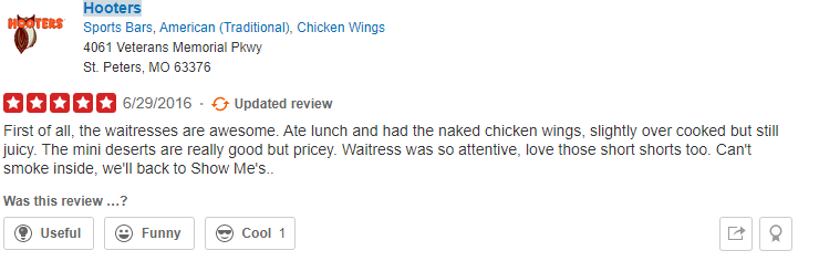 Our waitress was a wonderful young lady with a great personality and a row of teeth rotting out of her face. On the power ranking of the four waitresses working today I think we not get the best in show, if you know what I mean. How does this Hooters not do a job fair at the University of Memphis or stand outside of high school graduations?