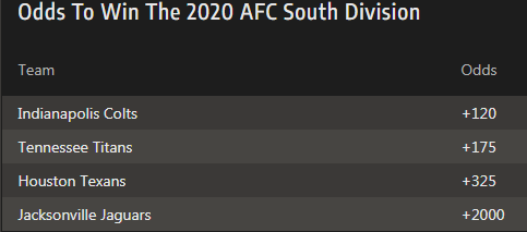 To be honest I don’t care about other NFL teams outside of the AFC south. Above arethe current odds to win the AFC South: